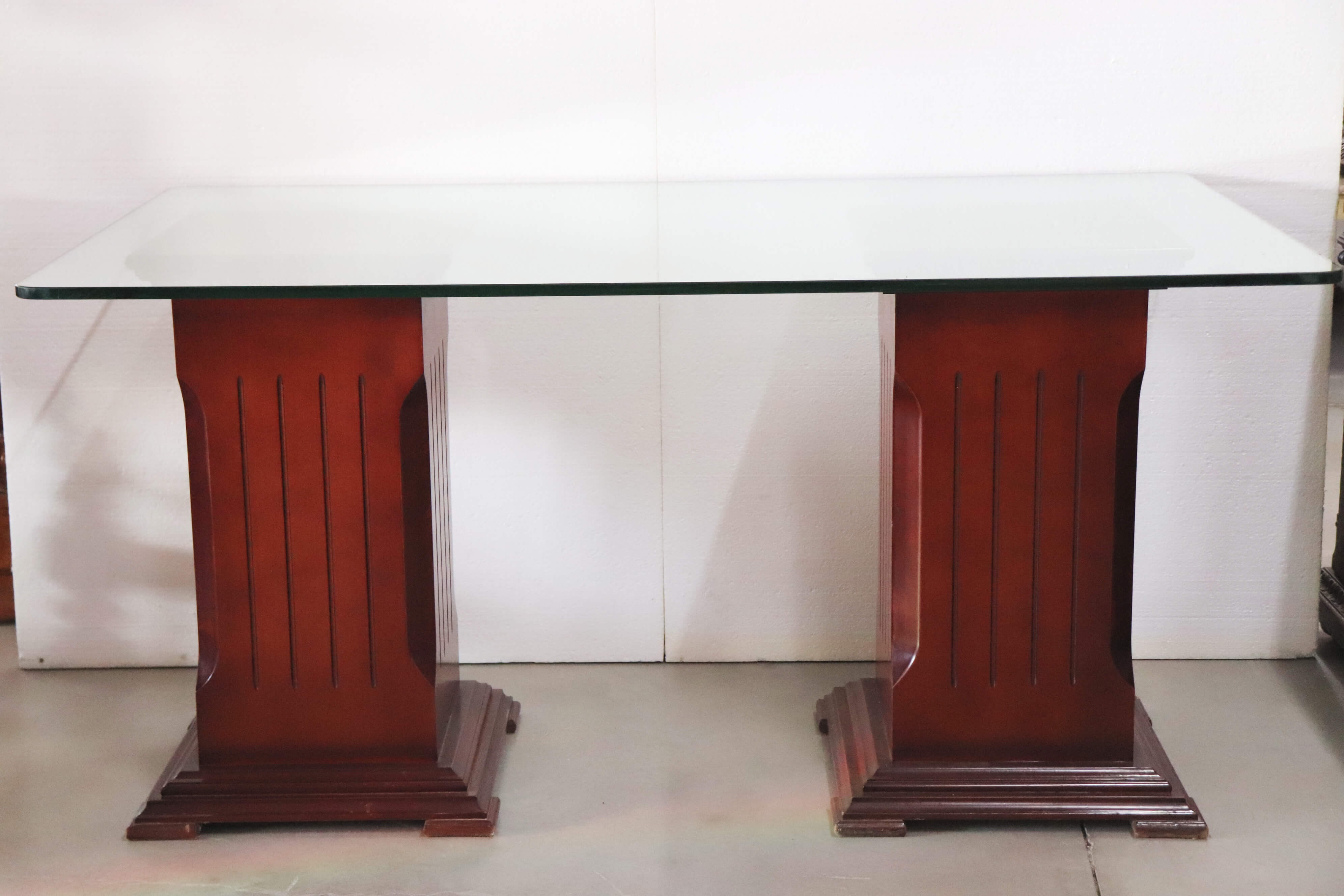 Mesa estilo imperial con cristal y 2 columnas de madera